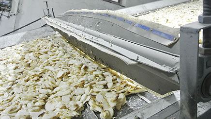 將需要干燥的山藥片放置在輸送帶上,經均料器后物料被平鋪在網帶上,輸送至烘干機內部,在烘干機箱體內呈“s"型逐層翻轉、下落,烘干后的淮山藥片從出料口流出。經過轉換后的熱風從烘干機底部進入,由于下部壓力大于上部壓力,熱氣流自下而上穿過每一層網帶和其上的淮山藥片層,逐層烘干,熱量交換均勻、充分,生產效率高,干燥品質好。